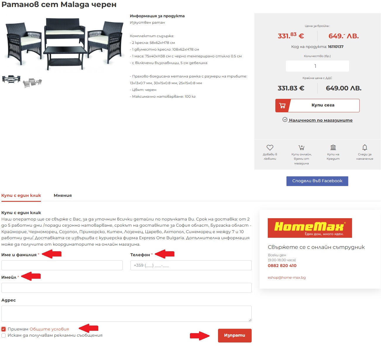 За Ваше удобство може да се възползвате от услугата ни „Купи с един клик“. Тази опция, която ще намерите под описанието на всеки артикул в сайта, Ви дава възможност да направите бърза поръчка без регистрация.
