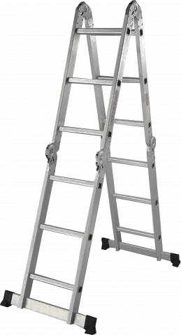 Многофункционални алуминиеви стълби от 4 секции, свързани посредством самоблокиращи се панти (стави), позволяващи да се работи със различни конфигурации на стълбата. Изключително компактни в сгънато положение.